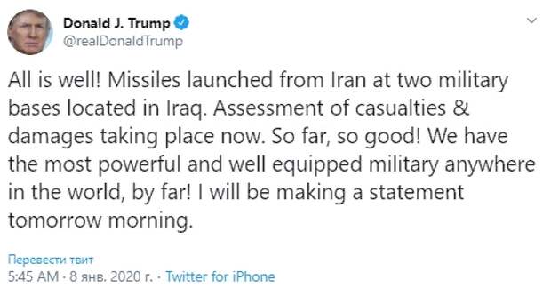Иранцы фактически родили легенду эпического масштаба.После чего МИД Ирана заявил «Иран действовал пропорционально, в целях самообороны и в соответствии с параграфом 51 Устава ООН, обстреляв базы, с которых трусливо осуществлялась атака против граждан и официальных лиц Ирана. Мы не ищем эскалации или войны, но будем защищать себя».